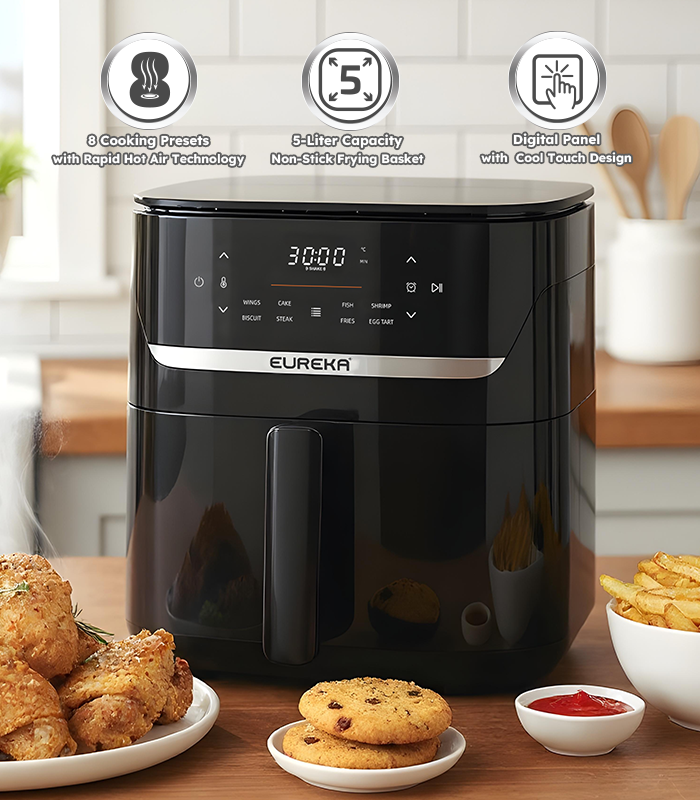 Enjoy crispy, delicious meals with little to no oil using the Eureka EEAF 5 LD SmartFry Digital Air Fryer. Designed for modern homes that value healthier cooking without sacrificing taste. Powered by rapid hot air technology, this air fryer circulates heat evenly for perfectly cooked meals every time.