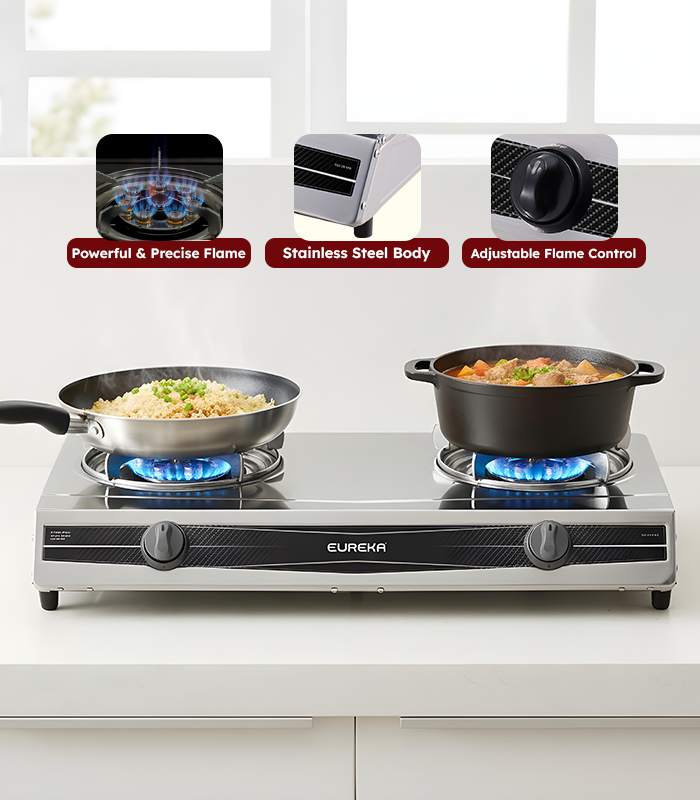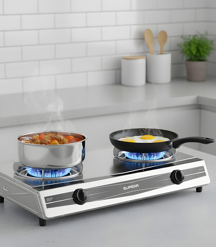 The Eureka EGS DB 8PB double burner gas stove features 8 durable brass burners for consistent heat and efficient cooking. Designed with a stainless steel body, anti-skid base, and automatic ignition, it ensures safe, fast, and reliable cooking performance for everyday use.