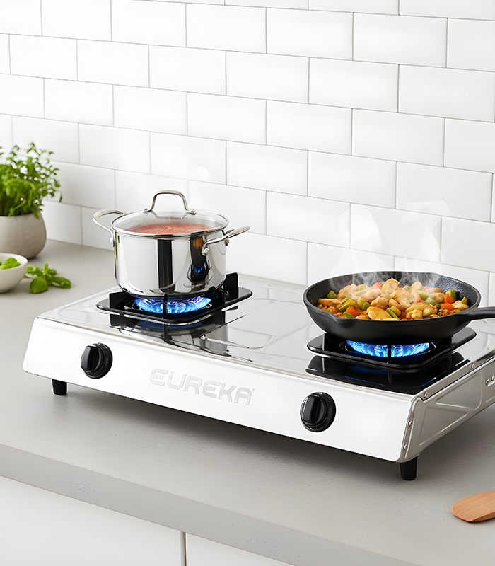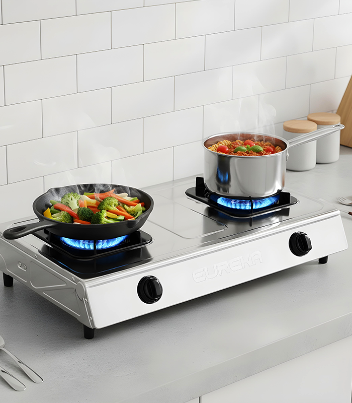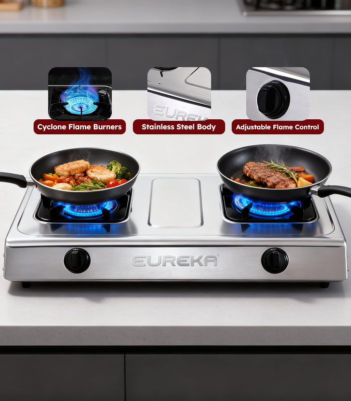 Cook faster and safer with powerful cyclone flame burners. Built with a stainless steel body, corrosion-resistant trivet, and anti-skid base for durability and stability. Features automatic ignition and precise flame control for easy everyday cooking.